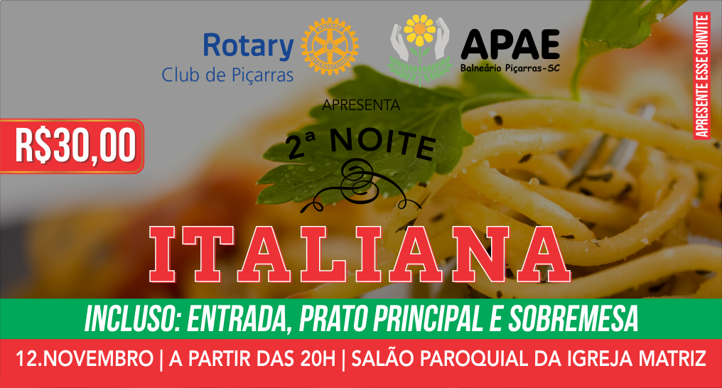 Vem aí, a 2ª NOITE ITALIANA promovida pelo Rotary Club de Piçarras com a parceria da APAE de Balneário Piçarras.